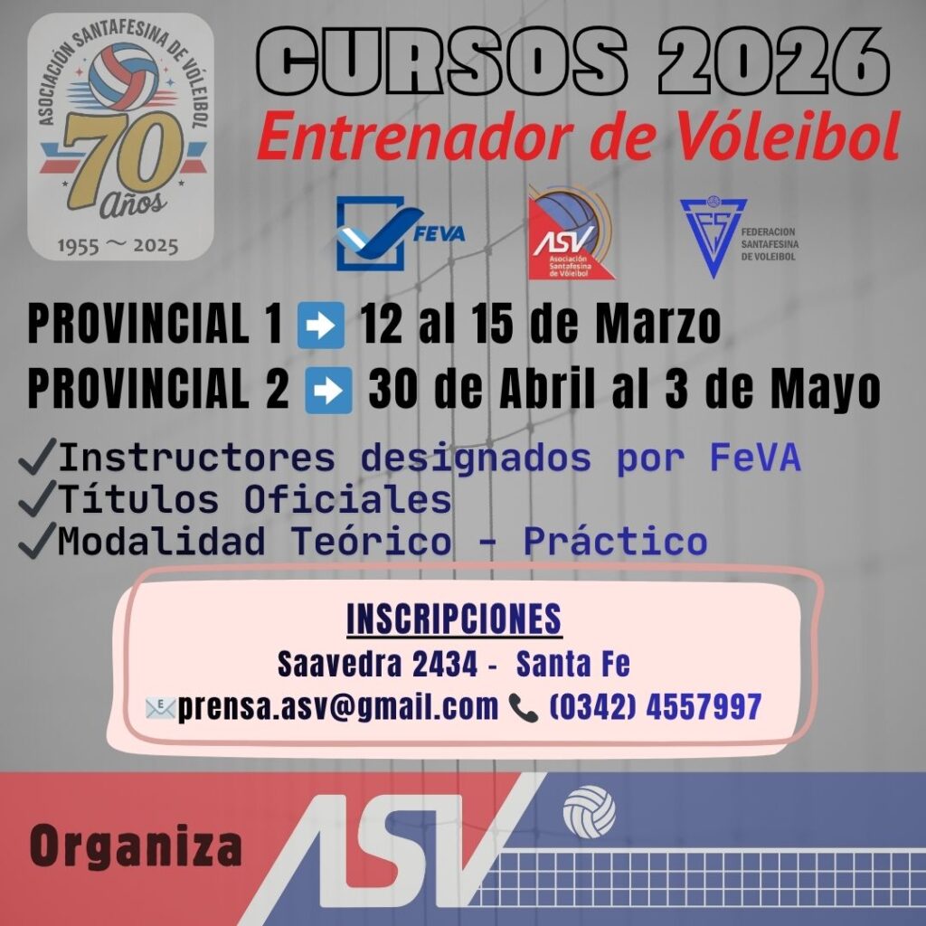 Durante este 2026 la Asociación Santafesina de Vóleibol organizará nuevamente Cursos para Entrenadores oficiales de la Federación del Vóleibol Argentino.